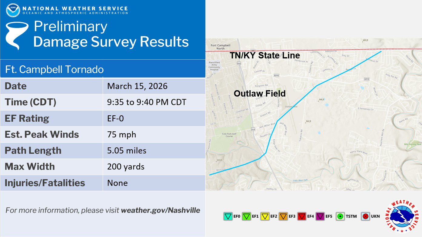 NWS in Nashville confirms EF-0 tornado touched down near Fort Campbell Sunday