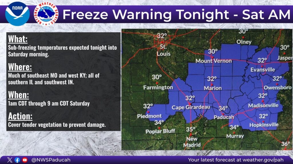 The National Weather Service in Paducah is putting out a Freeze Warning for late Friday night into Saturday morning, which means sensitive vegetation is in jeopardy. The Freeze Warning will […]