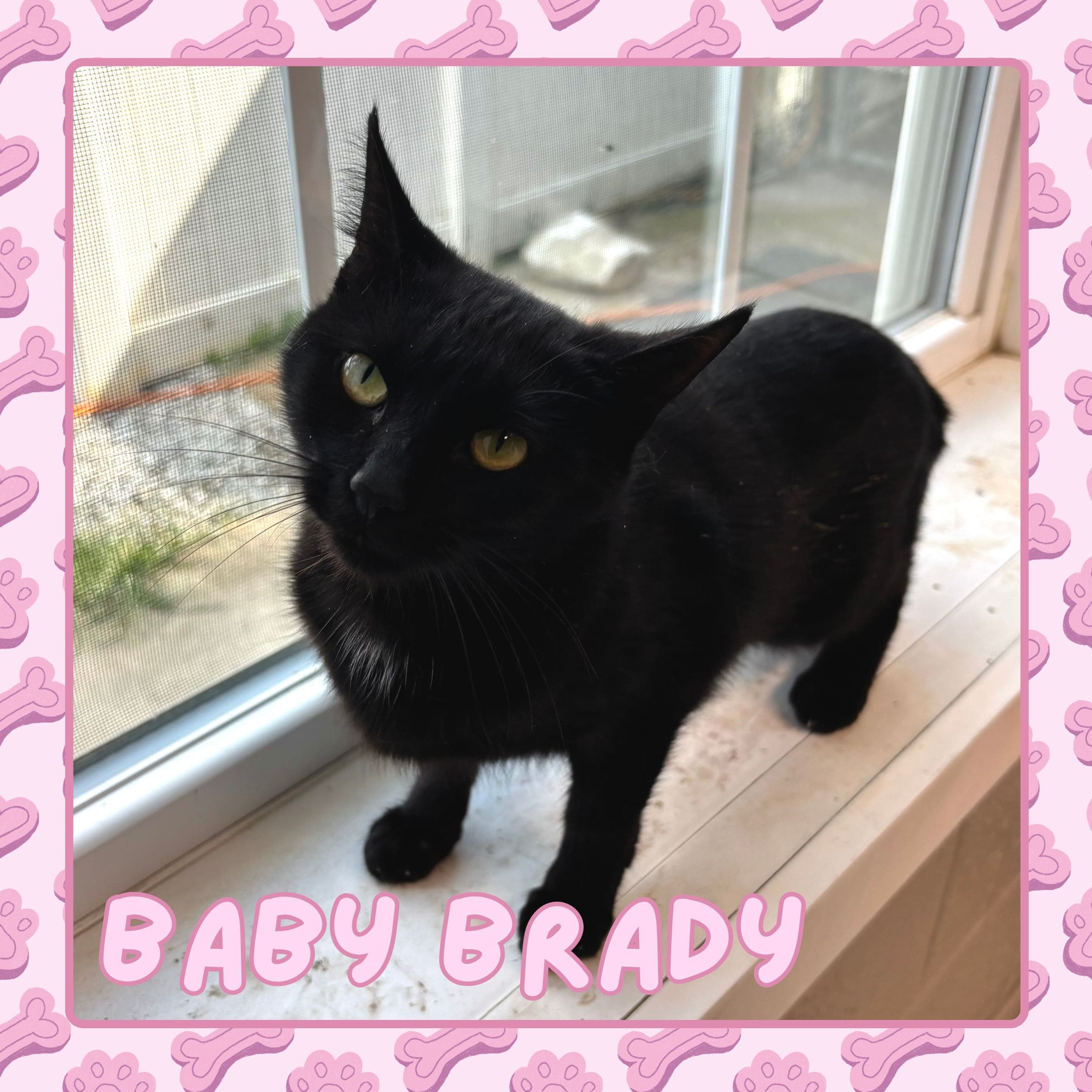 Baby Brady is a one-year-old domestic shorthaired cat who was found as a stray and has been a shelter resident for nearly a month. She has a loving personality and is looking for her forever home.