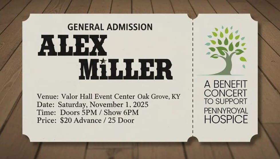 Former “American Idol” contestant and Kentucky Proud Spokesperson, Alex Miller is coming to Oak Grove to put on a show and help raise money for Pennyroyal Hospice this weekend.