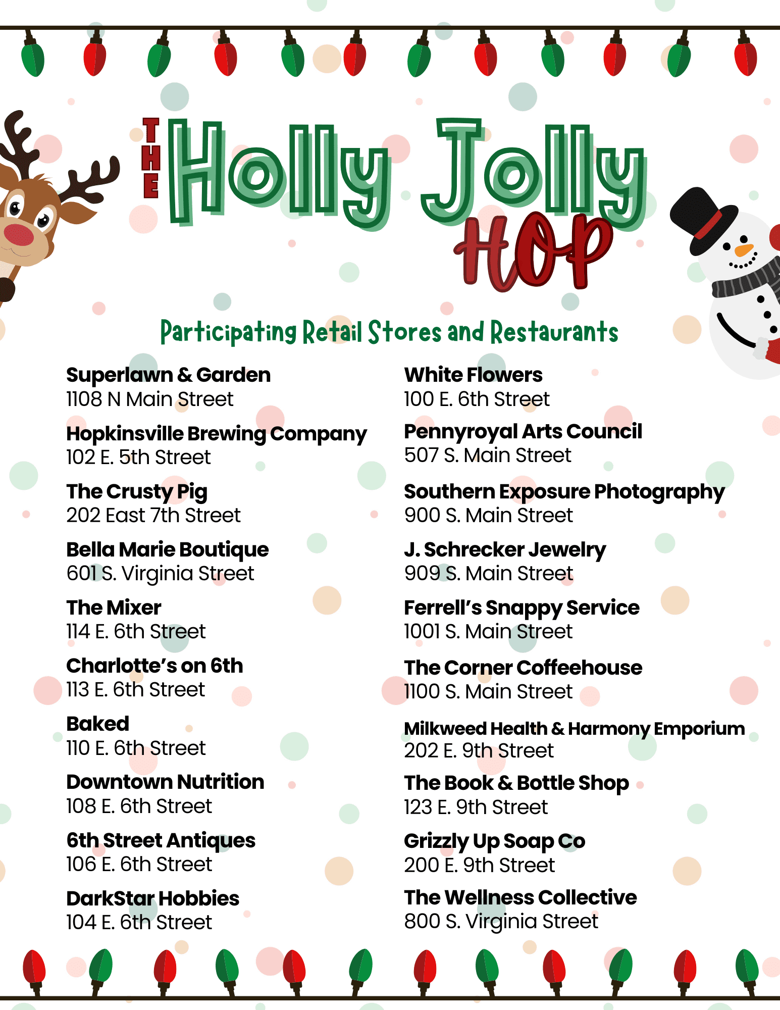 The Holly Jolly Hop Community Shop is a collaboration among the Christian County Chamber of Commerce, Downtown Renaissance District and the Hopkinsville Small Business Commission.