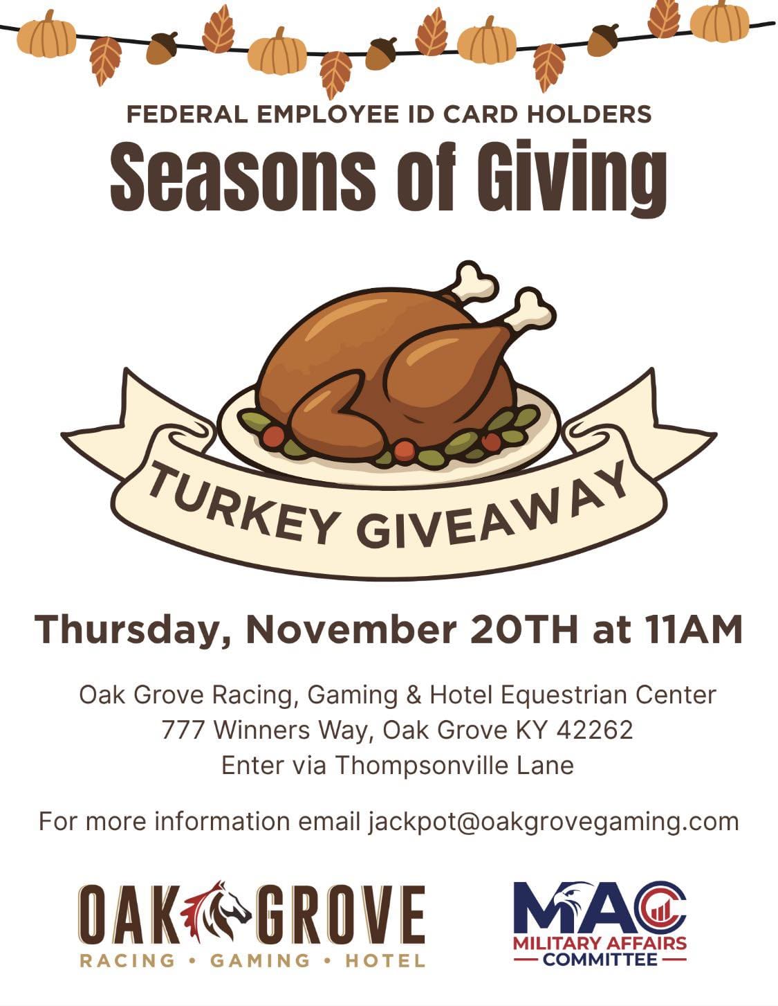 The turkey giveaway starts at 11 a.m. on November 20 at Oak Grove Racing, Gaming and Hotel located at 777 Winners Way. The giveaway will be set up near the equestrian center, so folks are asked to enter from Thompsonville Lane.