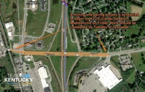 According to the Kentucky Transportation Cabinet, crews will begin milling work on Friday and into Saturday along Center Street from just east of Interstate 69 to the CSX Railroad Bridge. The top layer of asphalt will be ground down to create a more even surface for the roadway.