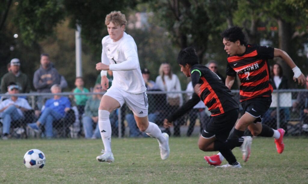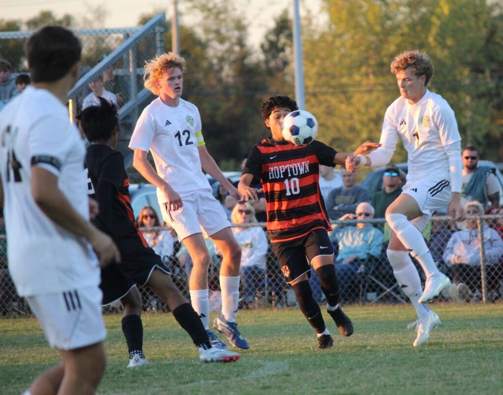The Blazers tied the game 1-1 with 36:35 to go in the game when keeper Hayden Fitzsimmons sent a long pass over the defense. Hayden Hunt sent a lazer toward Hoptown goalie Raul Rivera who knocked down the pass. In the scrum around the loose ball, Rivera tried to clear it out but the ball bounced off a Tiger player’s leg and into the goal.